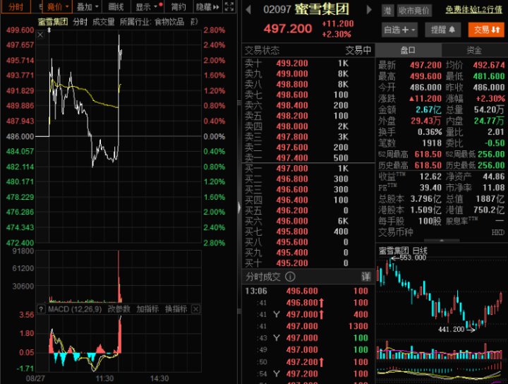 股价方面,早盘,蜜雪集团横盘走低,午后迅速拉升,截至记者发稿时,蜜雪集团涨2.30%,报497.200港元,总市值1887亿港元。