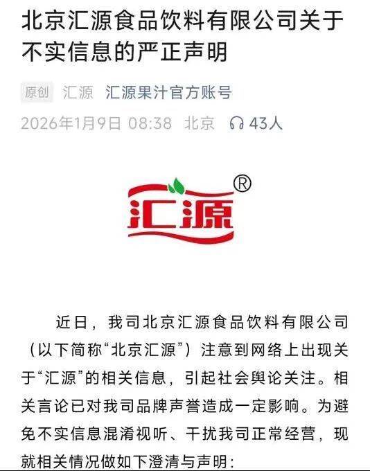 2026年1月8日,汇源集团通过微信公众号“汇源集团”和“汇源”(运营权归属于北京汇源食品饮料有限公司,以下简称“北京汇源”)发布声明——宣布汇源集团已全面接管北京汇源及其旗下“汇源”品牌业务。