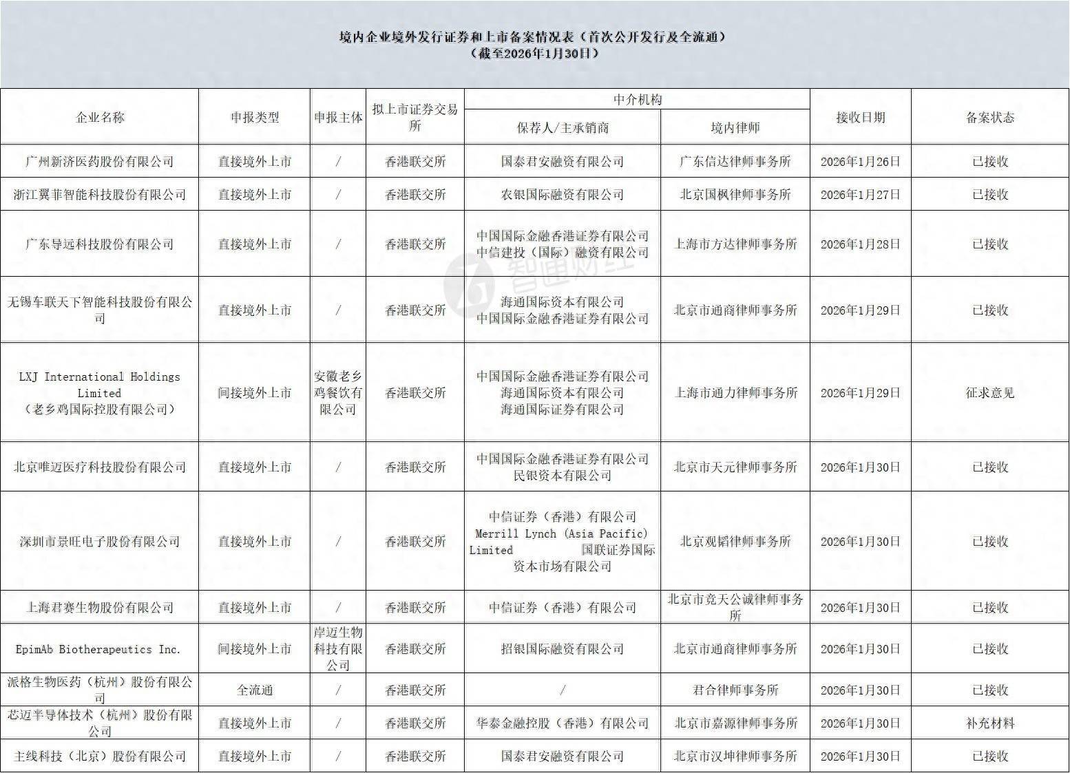 智通财经APP获悉在线配资交易·加杠网,1月30日,中国证监会发布《境内企业境外发行证券和上市备案情况表(首次公开发行及全流通)(截至2026年1月30日)》,其中在线配资交易·加杠网,新济医药、翼菲科技、导远科技、车联天下、唯迈医疗、景旺电子、君赛生物、主线科技拟香港IPO获中国证监会接收材料;老乡鸡(间接境外上市)拟香港IPO备案状态为征求意见;芯迈半导体拟香港IPO备案状态为补充材料。