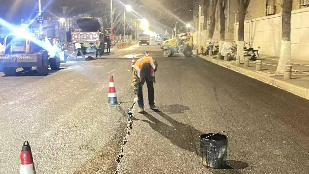3月14日夜晚,欢乐大道沿线灯火通明。洪山区城管执法局市政维护管理中心的作业人员身着反光背心,在夜色中紧张开展道路修补。铣刨机精准剔除破损路面,铁锹快速清走碎石渣土,工人紧随其后摊铺、找平、压实,每一道工序严谨有序。灯光下,反光条与施工灯交相辉映,他们以夜为昼、争分夺秒,只为把平整安全的道路留给白天的市民与跑者。