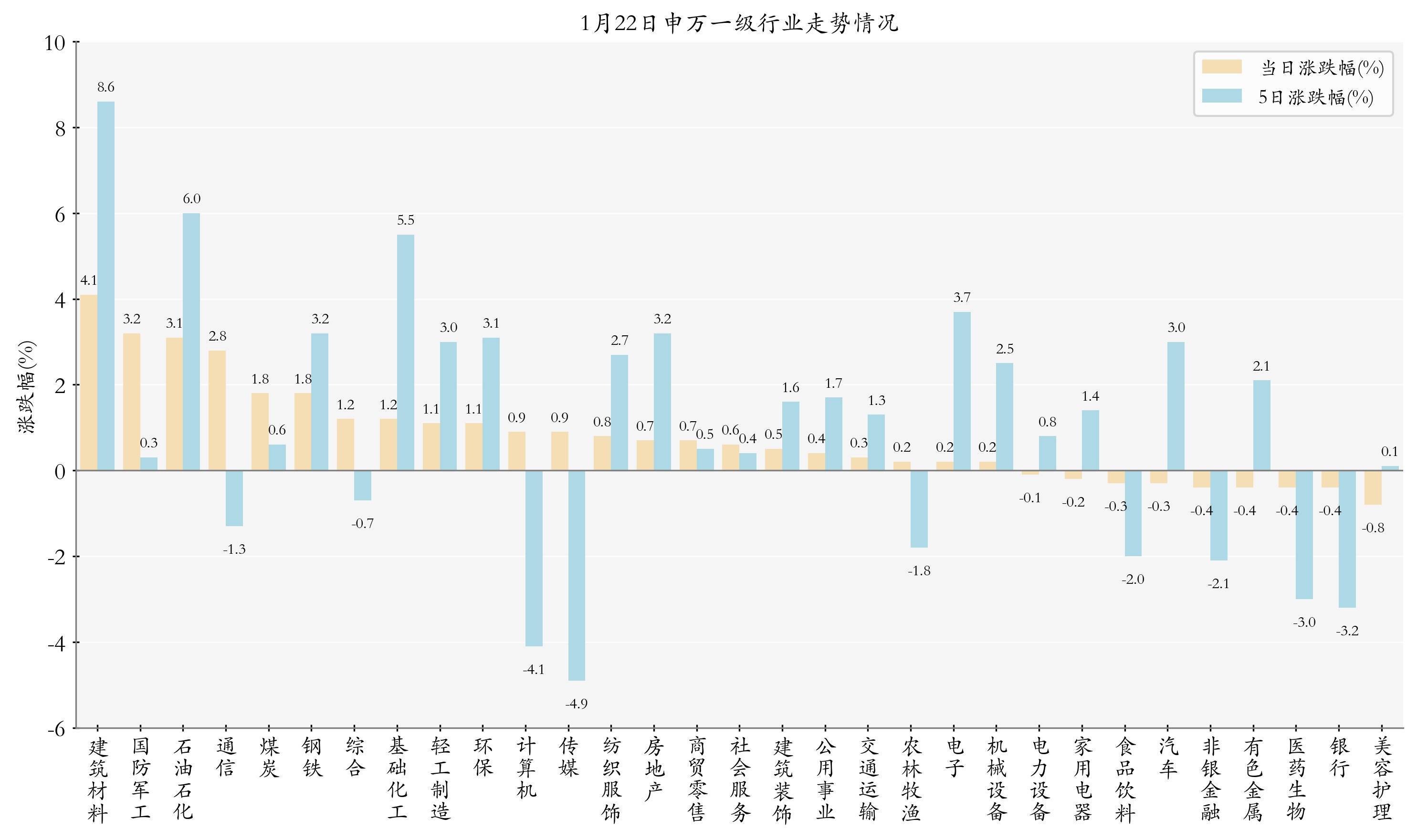 统计今日全部申万一级行业涨跌幅情况,建筑材料、国防军工与石油石化今日走势排名靠前,日涨跌幅分别为4.09%、3.23%与3.07%,美容护理、银行与医药生物的走势排名靠后,日涨跌幅分别是-0.76%、-0.43%与-0.42%;近5个交易日建筑材料、石油石化与基础化工的走势排名靠前,近5日涨跌幅分别为8.6%、6.01%与5.49%,传媒、计算机与银行的走势排名靠后,近5日涨跌幅分别为-4.87%、-4.09%与-3.19%。