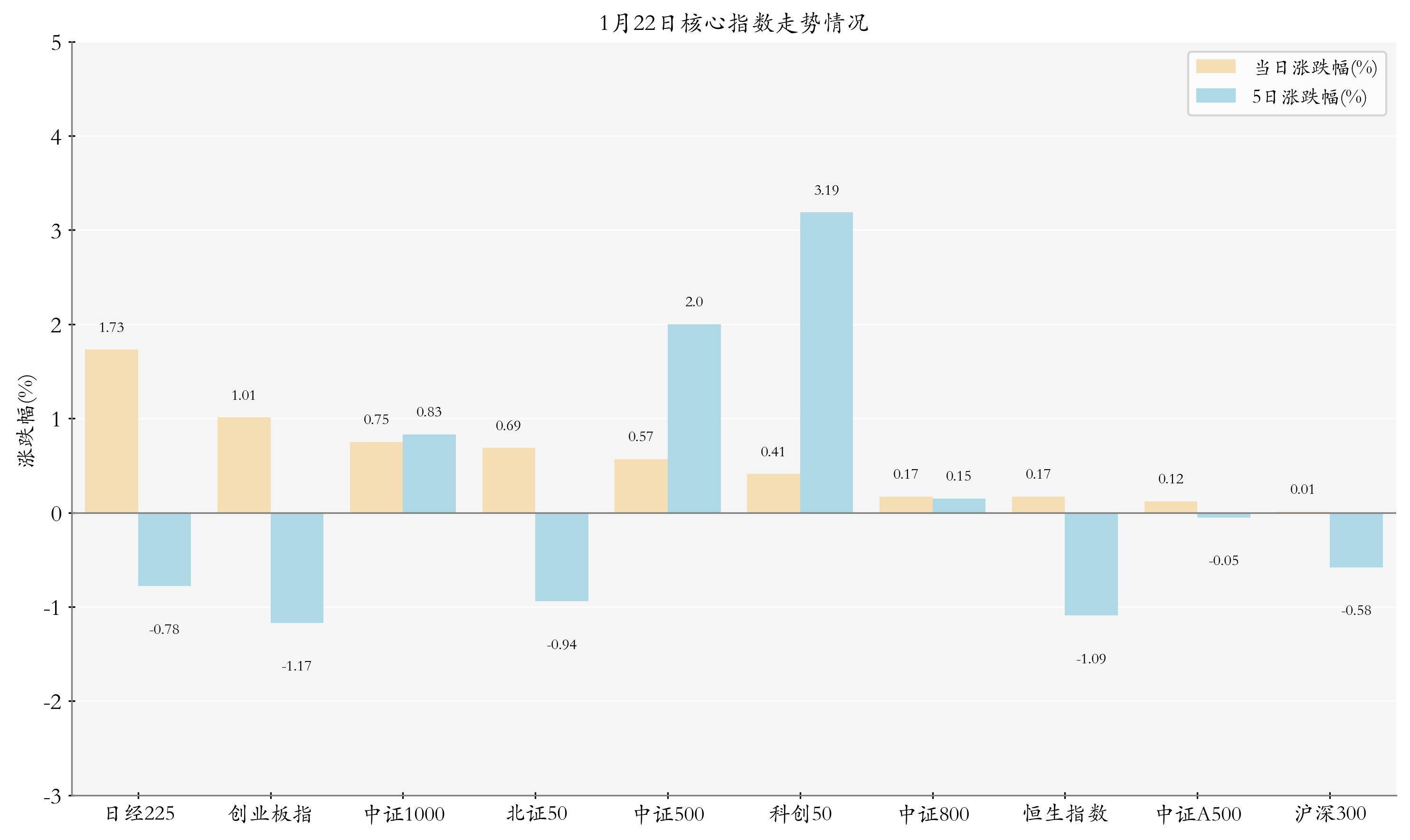 统计A股与海外主要核心指数走势,今日(1月22日,下同)三大指数集体上涨,其中上证指数上涨0.14%,收于4122.58点,日内最高4140.84点;深证成指上涨0.5%,收于14327.05点,日内最高14374.51点;创业板指上涨1.01%,收于3328.65点,日内最高3337.27点。今日日经225、创业板指与中证1000走势排名靠前,日涨跌幅分别为1.73%、1.01%与0.75%;近5个交易日科创50、中证500与中证1000的走势排名靠前,近5日涨跌幅分别为3.19%、2.0%与0.83%。