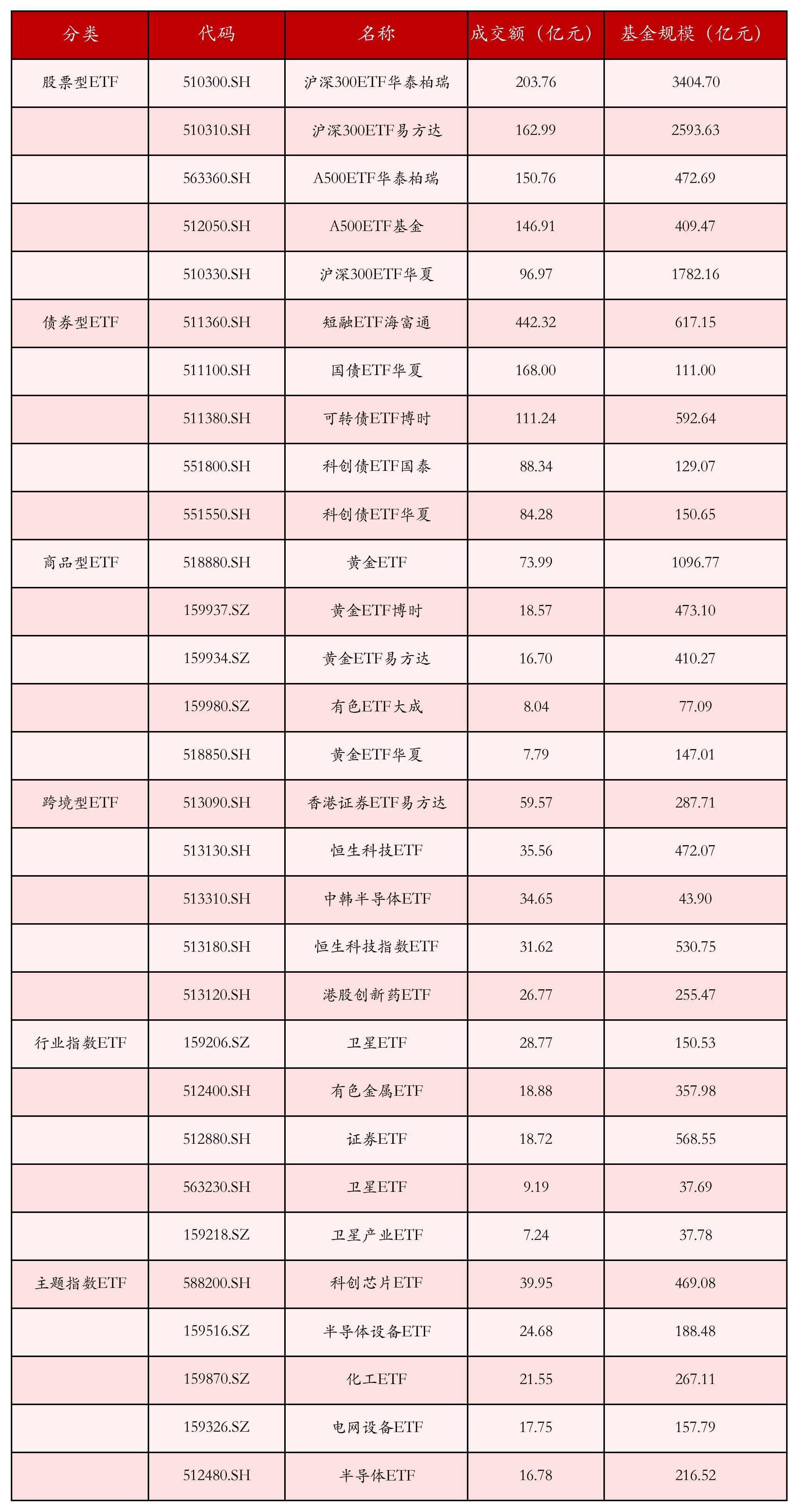 基于成交额对各类ETF今日的成交情况进行统计,成交额靠前的ETF产品如下表所示。股票型ETF中成交额排名前3位的ETF产品分别为沪深300ETF华夏(510330.SH)、沪深300ETF华泰柏瑞(510300.SH)和沪深300ETF易方达(510310.SH),今日成交额分别为96.97亿元、203.76亿元和162.99亿元。