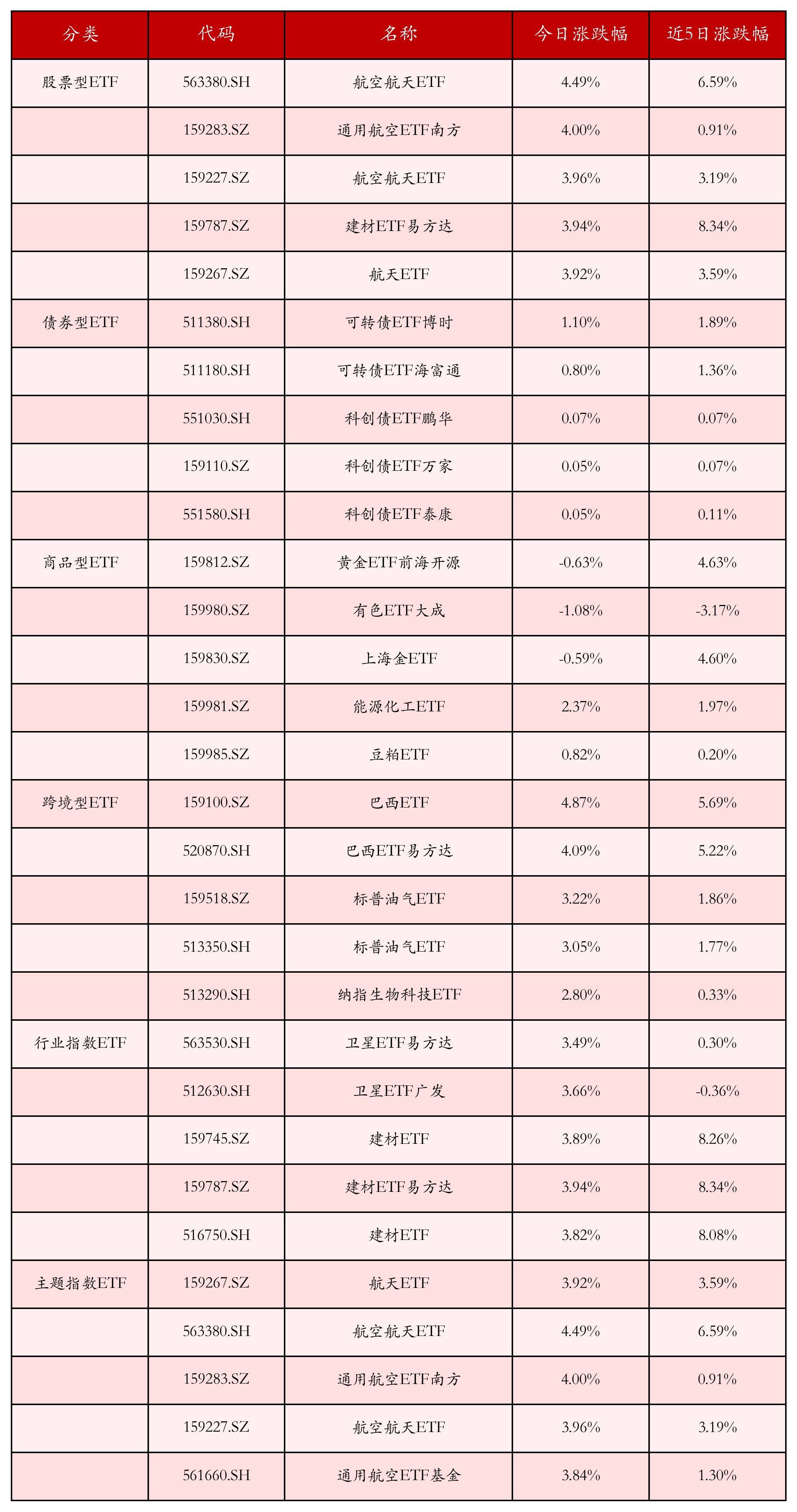 从不同投资种类、行业、主题的ETF产品中找出今日走势行情排名前5的ETF基金,今日涨幅靠前的ETF产品如下表所示。股票型ETF中涨跌幅排名前3位的ETF产品分别为航空航天ETF(563380.SH)、通用航空ETF南方(159283.SZ)和航空航天ETF(159227.SZ),今日收益率分别为4.49%、4.00%和3.96%。