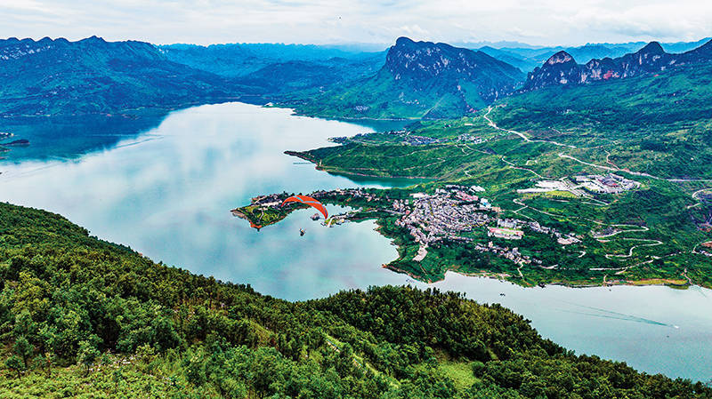 游客在贵州省六盘水市六枝特区牂牁江畔体验低空滑翔飞行(2025 年 7 月 9 日摄) 陶亮摄 / 本刊传统产业焕“新”