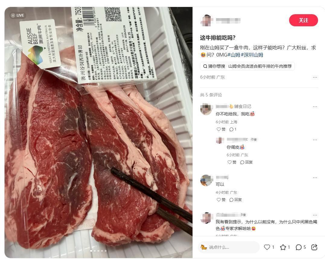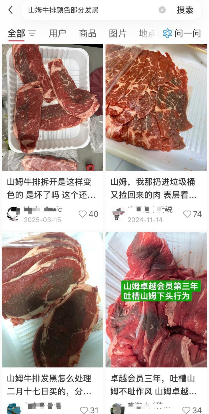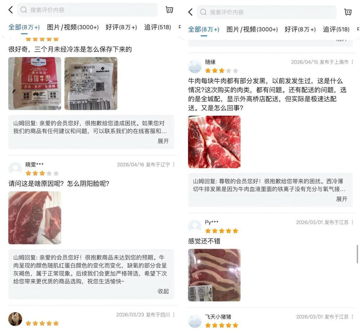 记者调查发现,在山姆小程序上已有不少消费者反映过类似情况。用户“随缘”评论称,购买的牛肉每块都有部分发黑,并质问“这是什么情况?”。还有用户在线上针对牛肉的“阴阳脸”询问原因。