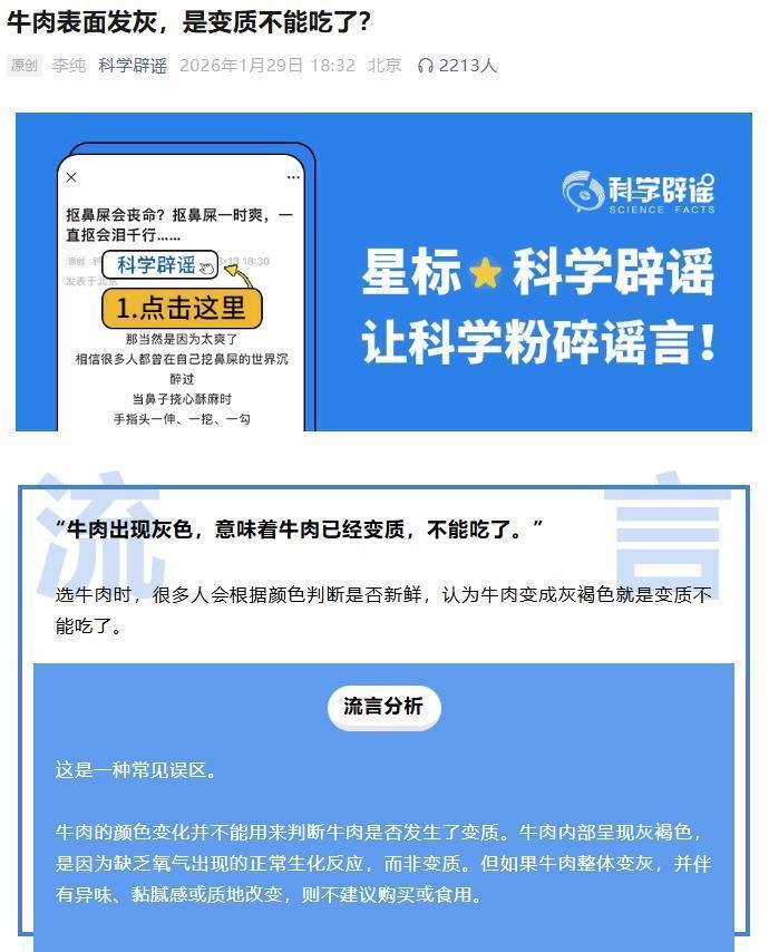 面对消费者的普遍担忧,由中国科协、卫生健康委、应急管理部和市场监管总局等部委主办的“科学辟谣”公众号发文进行了权威澄清。文章指出,“牛肉出现灰色,意味着牛肉已经变质不能吃了”是一种常见的误区。